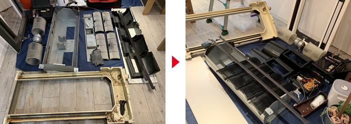 弊社では、脱着せずに室内機の熱交換器をワイヤーで吊るしながら全てのパーツを分解して洗浄していきます。